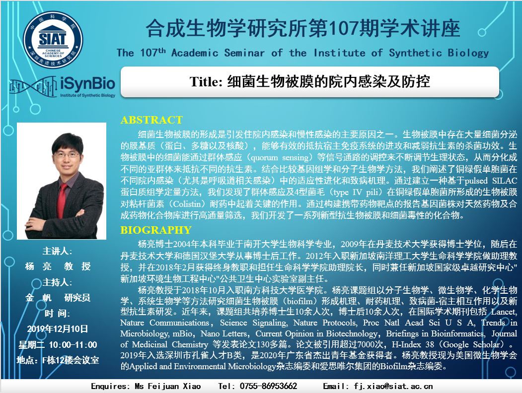 本次讲座邀请了 南方科技大学 杨亮 教授 带来“细菌生物被膜的院内感染及防控”的报告。