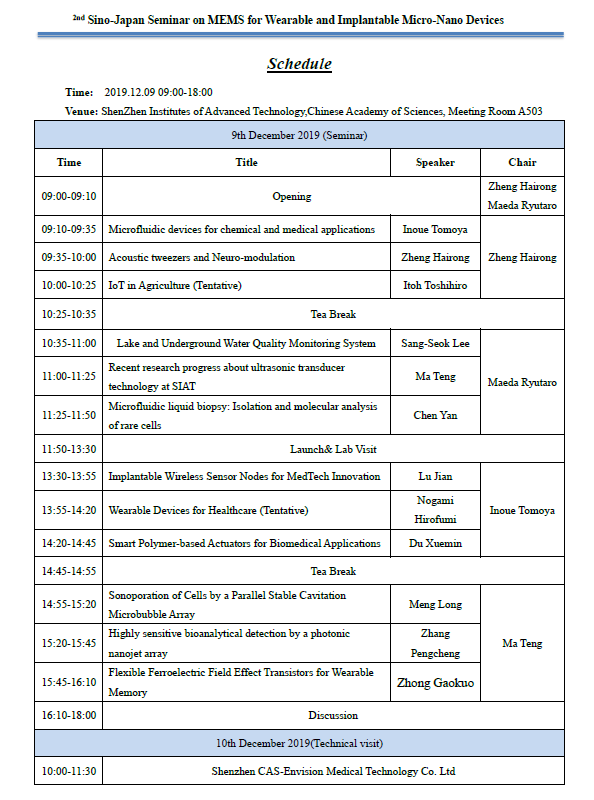 【2019年12月9日】2nd Sino-Japan Seminar on MEMS for Wearable and Implantable Micro-Nano Devices