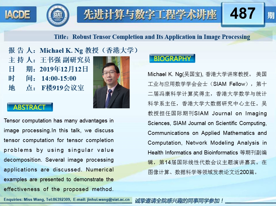 大家好!先进计算与数字工程学术讲座第487期将于将于12月12日 14:00-15:00在F栋919会议室举行,本次讲座将邀请香港大学 Michael K. Ng 教授作题为“Robust Tensor Completion and Its Application in Image Processing”的报告。本次报告将由数字所王书强 副研究员主持,诚挚邀请大家参加、学习和交流!