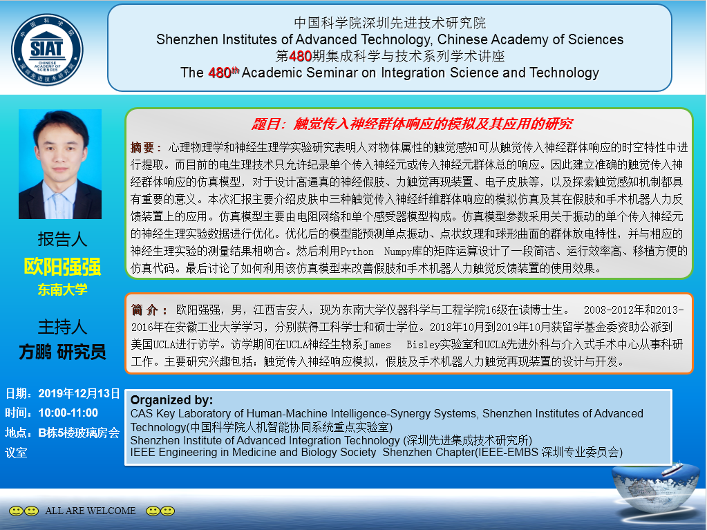 集成所第480期集成科学与技术系列学术讲座将于12月13日(周五)上午10:00~11:00在B区5楼玻璃房会议室召开。本次讲座特邀东南大学的欧阳强强博士作题为《触觉传入神经群体响应的模拟及其应用的研究》的学术报告。