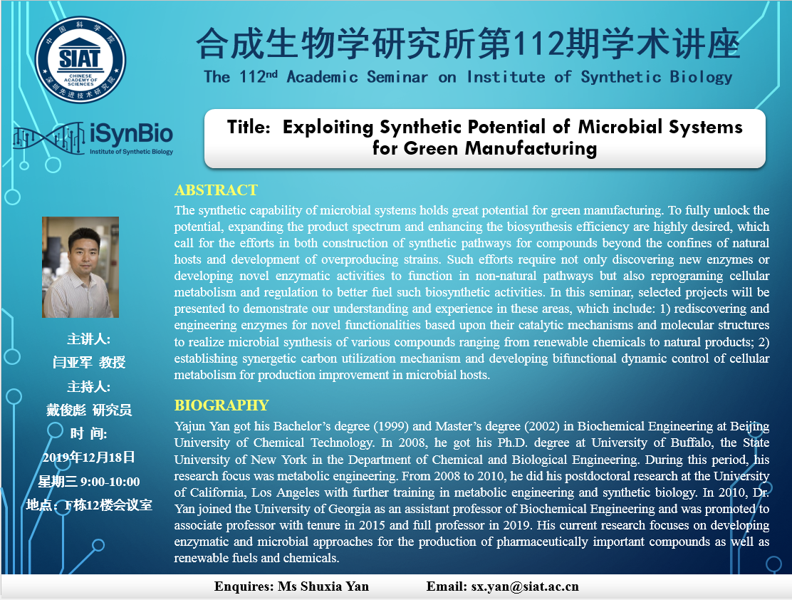 本次讲座邀请了 佐治亚大学 闫亚军 教授 带来“Exploiting Synthetic Potential of Microbial Systems for Green Manufacturing”的报告。