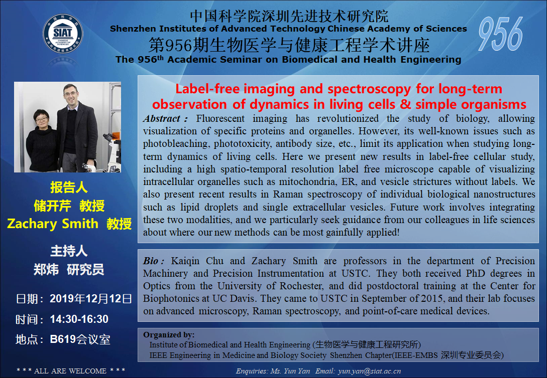 大家好!医工所将于2019年12月12日(周四)下午14:30-16:30,在 B619会议室 举办第956期生物医学与健康工程学术讲座,特邀 中国科学技术大学 储开芹教授 和 Zachary Smith教授 作题为“Label-free imaging and spectroscopy for long-term observation of dynamics in living cells & simple organisms”的学术报告。诚挚邀请大家参加学习和交流!