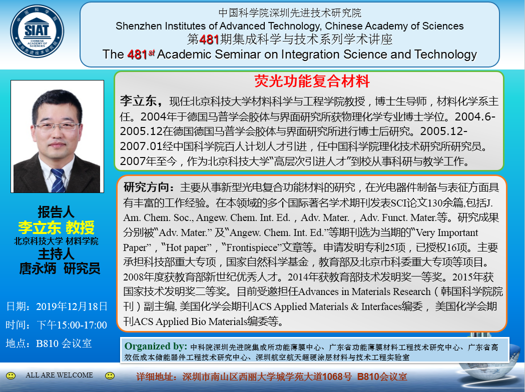 集成所第481期集成科学与技术系列学术讲座将于12月18日(周三)下午15:00~17:00在B810会议室召开。本次讲座特邀北京科技大学的李立东教授作题为《荧光功能复合材料》的学术报告。