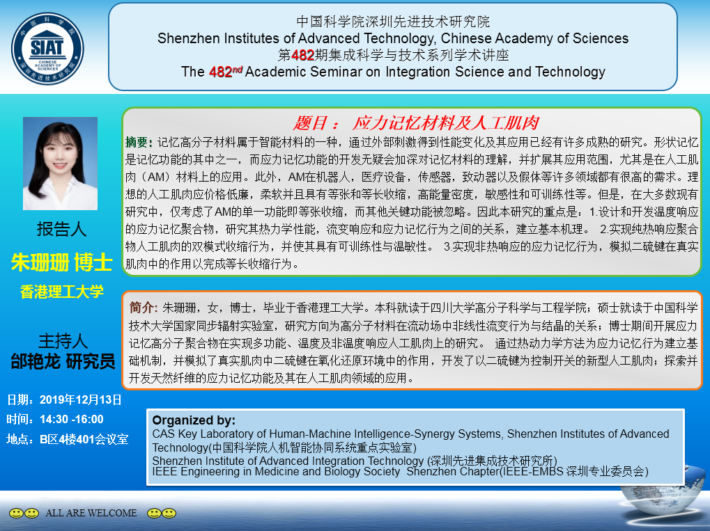 集成所第482期集成科学与技术系列学术讲座将于12月13日(今天)下午14:30~16:00在B401会议室召开。本次讲座特邀香港理工大学的朱珊珊博士作题为《应力记忆材料及人工肌肉》的学术报告。