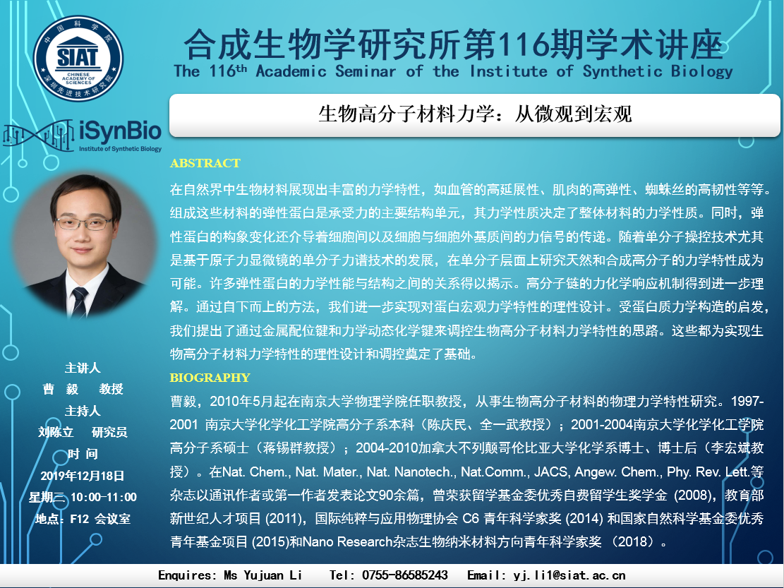 本次讲座邀请了 南京大学 曹 毅 教授 带来“生物高分子材料力学:从微观到宏观”的报告。