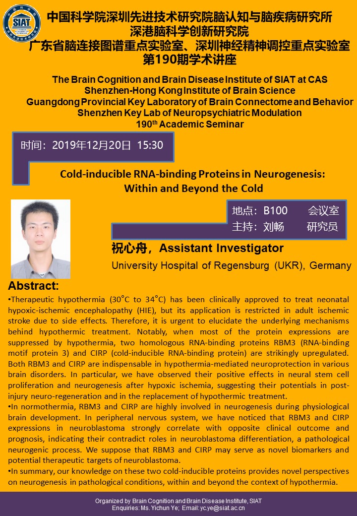 大家好!脑认知与脑疾病研究所将于2019年12月20日15:30,在B100会议室举办第一百九十期学术讲座,本次讲座由University Hospital of Regensburg,祝心舟博士做题为“ Cold-inducible RNA-binding Proteins in Neurogenesis: Within and Beyond the Cold ”的专题报告。
