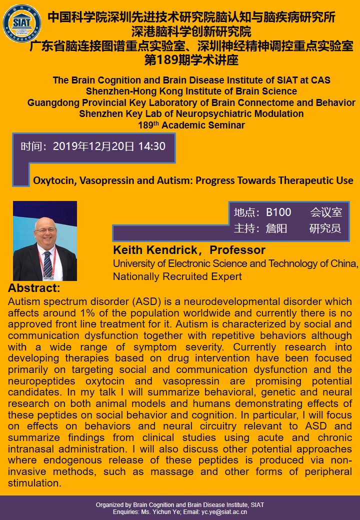 大家好!脑认知与脑疾病研究所将于2019年12月20日14:30,在B100会议室举办第一百八十九期学术讲座,本次讲座由电子科技大学,Keith Kendrick教授做题为“ Oxytocin, Vasopressin and Autism: Progress Towards Therapeutic Use ”的专题报告。