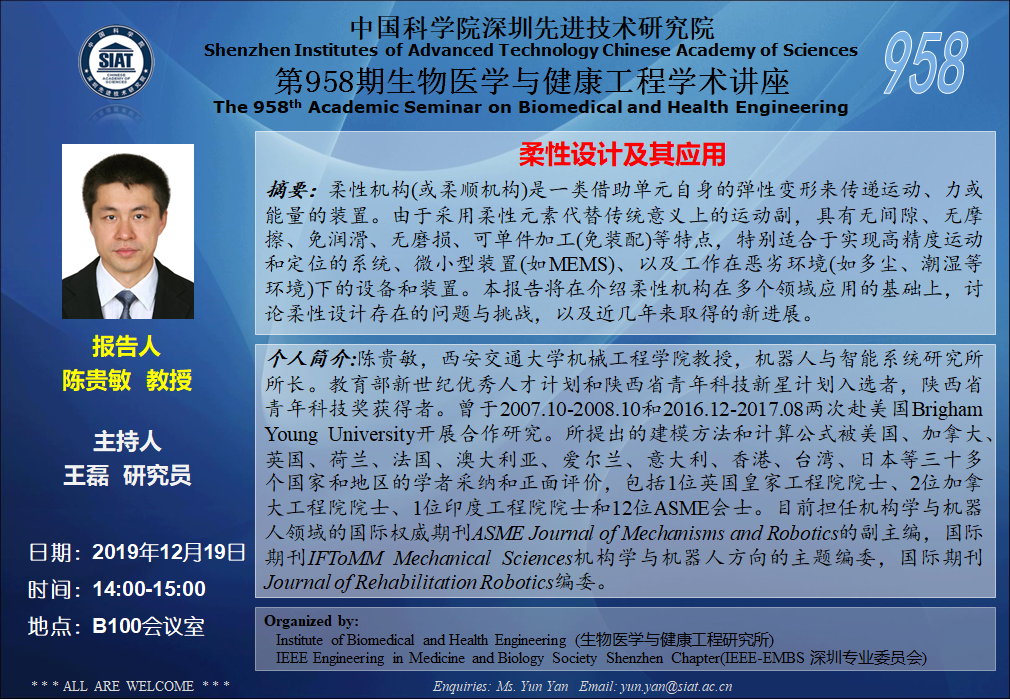 大家好!医工所将于2019年12月19日(周四)下午14:00-15:00,在 B100会议室 举办第958期生物医学与健康工程学术讲座,特邀 西安交通大学 陈贵敏教授 作题为“柔性设计及其应用”的学术报告。诚挚邀请大家参加学习和交流!