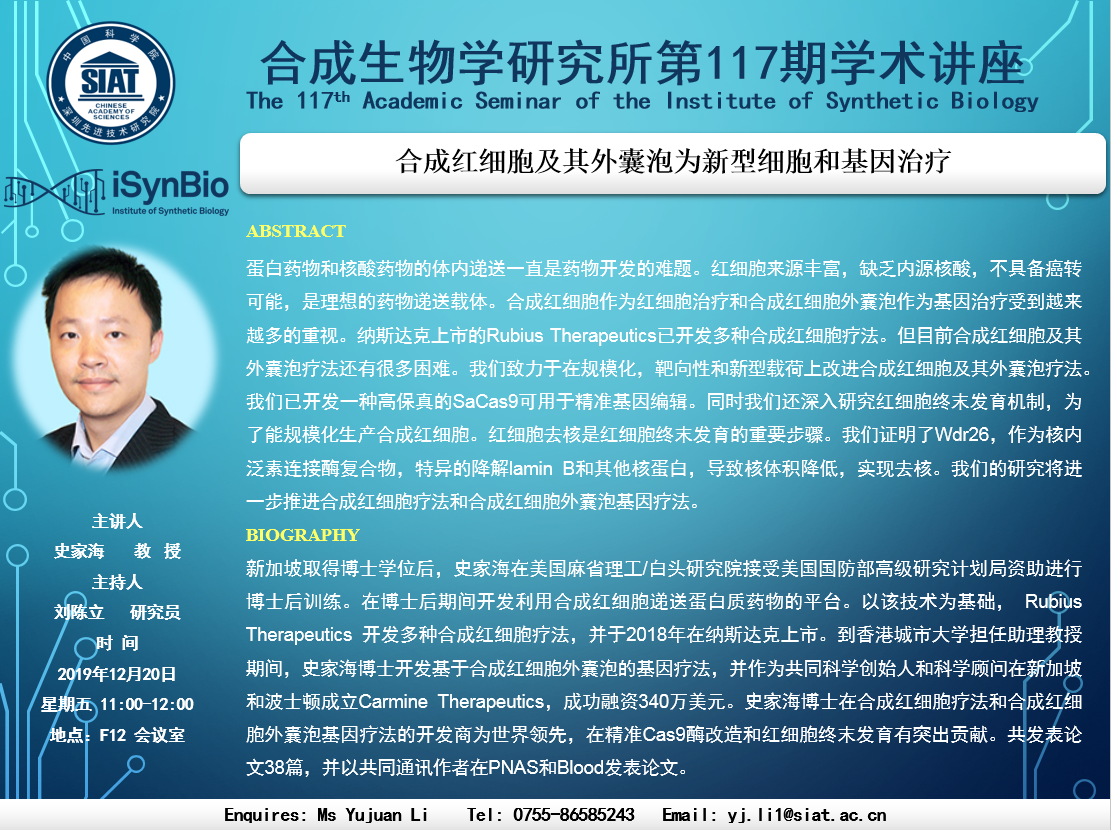 本次讲座邀请了 香港城市大学 史家海 教授 带来“合成红细胞及其外囊泡为新型细胞和基因治疗”的报告。