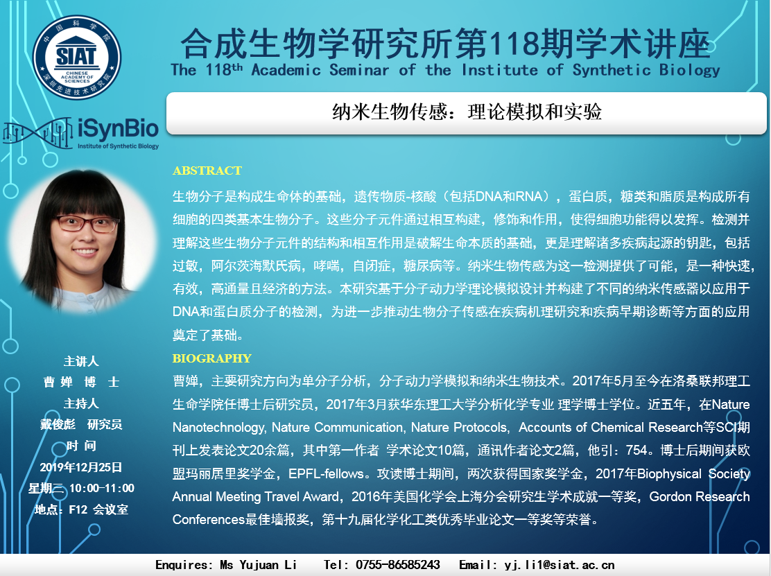 本次讲座邀请了 洛桑联邦理工生命学院 曹 婵 博士带来“纳米生物传感:理论模拟和实验”的报告。