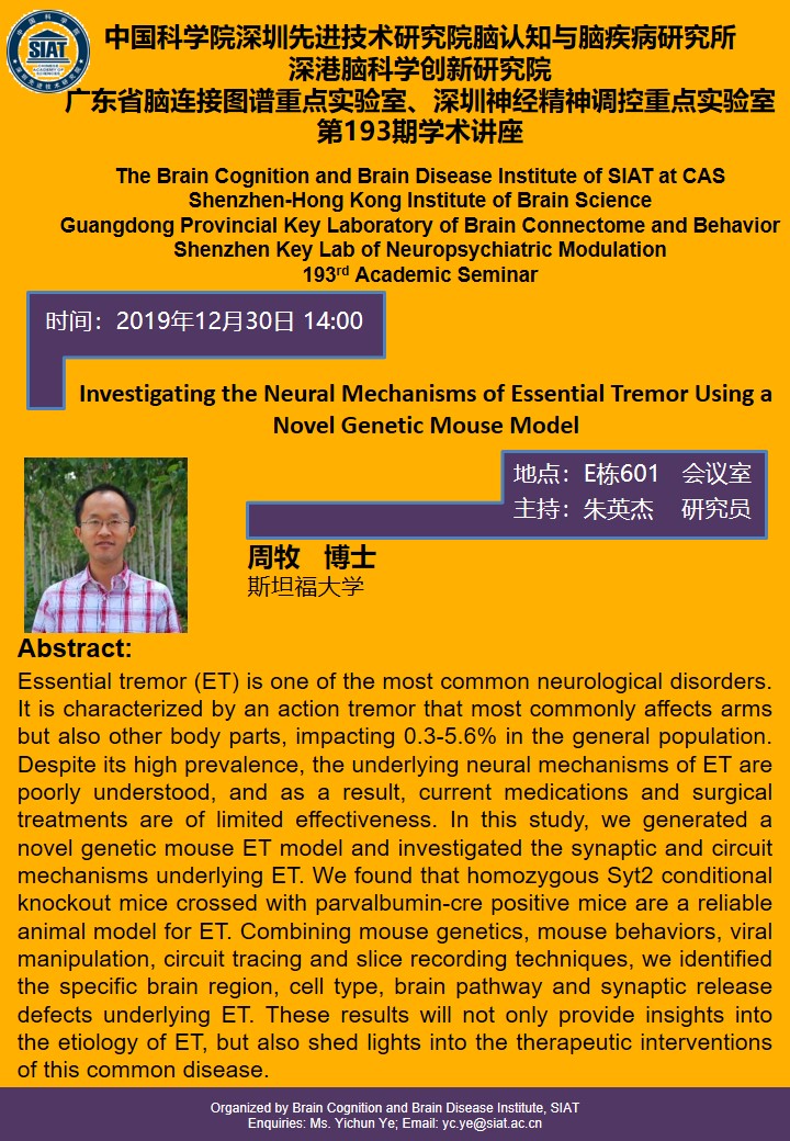 大家好!脑认知与脑疾病研究所将于2019年12月30日14:00,在E栋601会议室举办第一百九十三期学术讲座,本次讲座由斯坦福大学,周牧博士做题为“Investigating the Neural Mechanisms of Essential Tremor Using a Novel Genetic Mouse Model”的专题报告。
