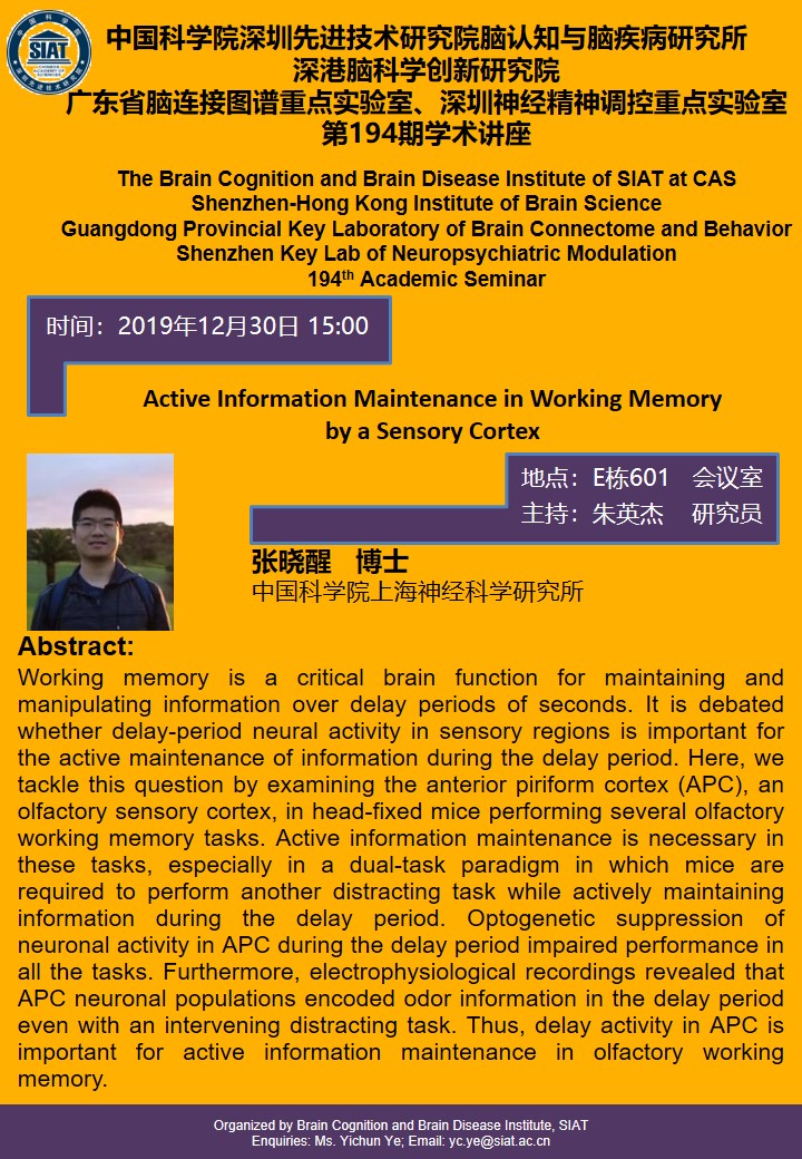 大家好!脑认知与脑疾病研究所将于2019年12月30日15:00,在E栋601会议室举办第一百九十四期学术讲座,本次讲座由中国科学院上海神经科学研究所,张晓醒博士做题为“Active Information Maintenance in Working Memory by a Sensory Cortex”的专题报告。