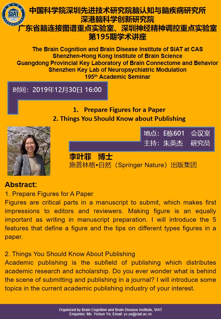大家好!脑认知与脑疾病研究所将于2019年12月30日16:00,在E栋601会议室举办第一百九十五期学术讲座,本次讲座由施普林格?自然(Springer Nature)出版集团,李叶菲博士做题为“1.Prepare Figures for a Paper; 2. Things You Should Know about Publishing”的专题报告。