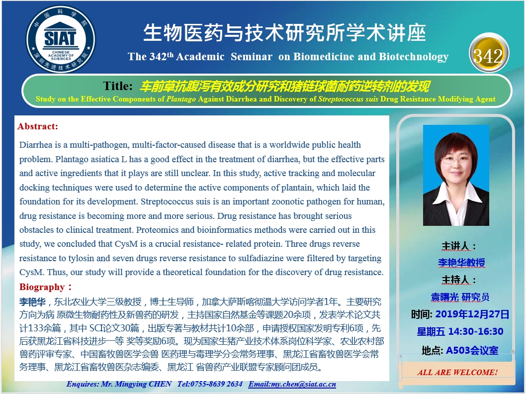 医药所第342期学术讲座将于2019年12月27日星期五14:30-16:30在先进院B1216-1会议室举行。本次讲座邀请了 李艳华教授带来“ 车前草抗腹泻有效成分研究和猪链球菌耐药逆转剂的发现 ”的报告。届时,袁曙光研究员将主持讲座。