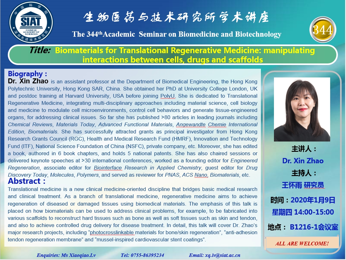 医药所第344期学术讲座将于2020年1月9日星期四14:00-15:00在先进院B1216-1会议室举行。本次讲座邀请了来自香港理工大学的赵昕博士带来“Biomaterials for Translational Regenerative Medicine: manipulating interactions between cells, drugs and scaffolds”的报告。届时,王怀雨 研究员将主持讲座。