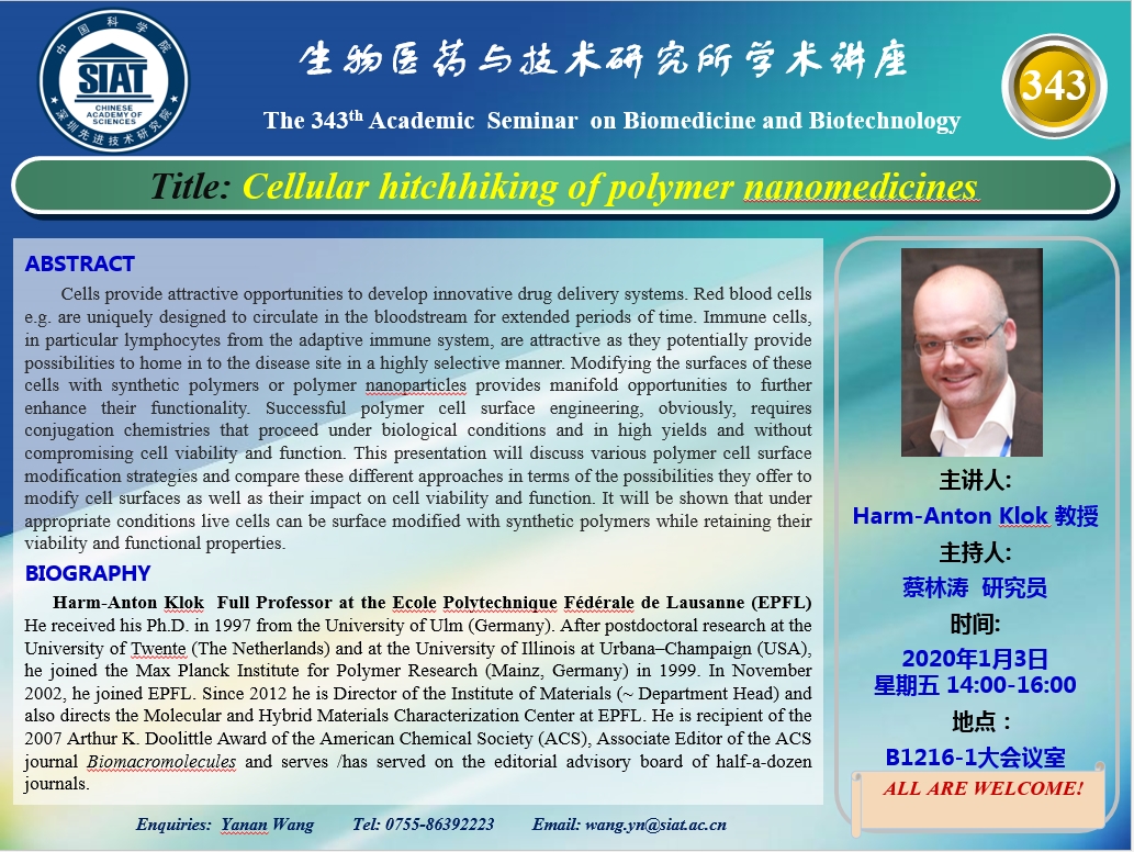 医药所第343期学术讲座将于2020年1月2日星期四14:00-16:00在先进院B1216-1会议室举行。本次讲座邀请了来自瑞士洛桑联邦理工学院的Harm-Anton Klok 教授带来“ Cellular hitchhiking of polymer nanomedicines ”的报告。届时,蔡林涛 研究员将主持讲座。