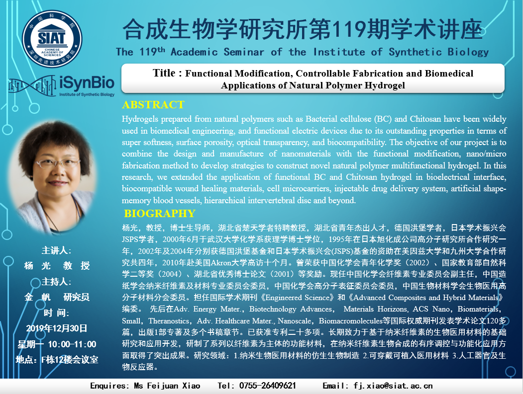 【2019年12月30日 合成所】Functional Modification, Controllable Fabrication and Biomedical Applications of Natural Polymer Hydrogel