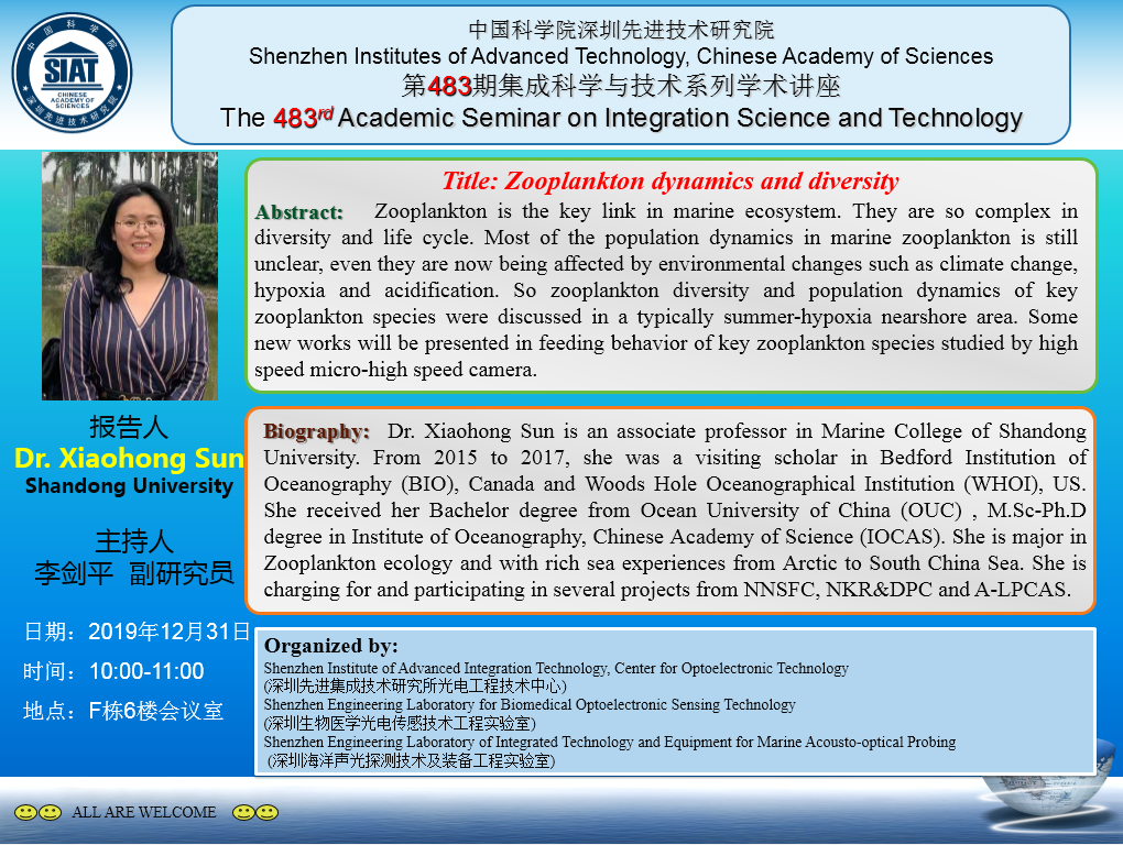 集成所第483期集成科学与技术系列学术讲座将于12月31日(明天)上午10:00~11:00在F栋6楼会议室召开。本次讲座特邀山东大学的孙晓红博士作题为《Zooplankton dynamics and diversity》的学术报告。