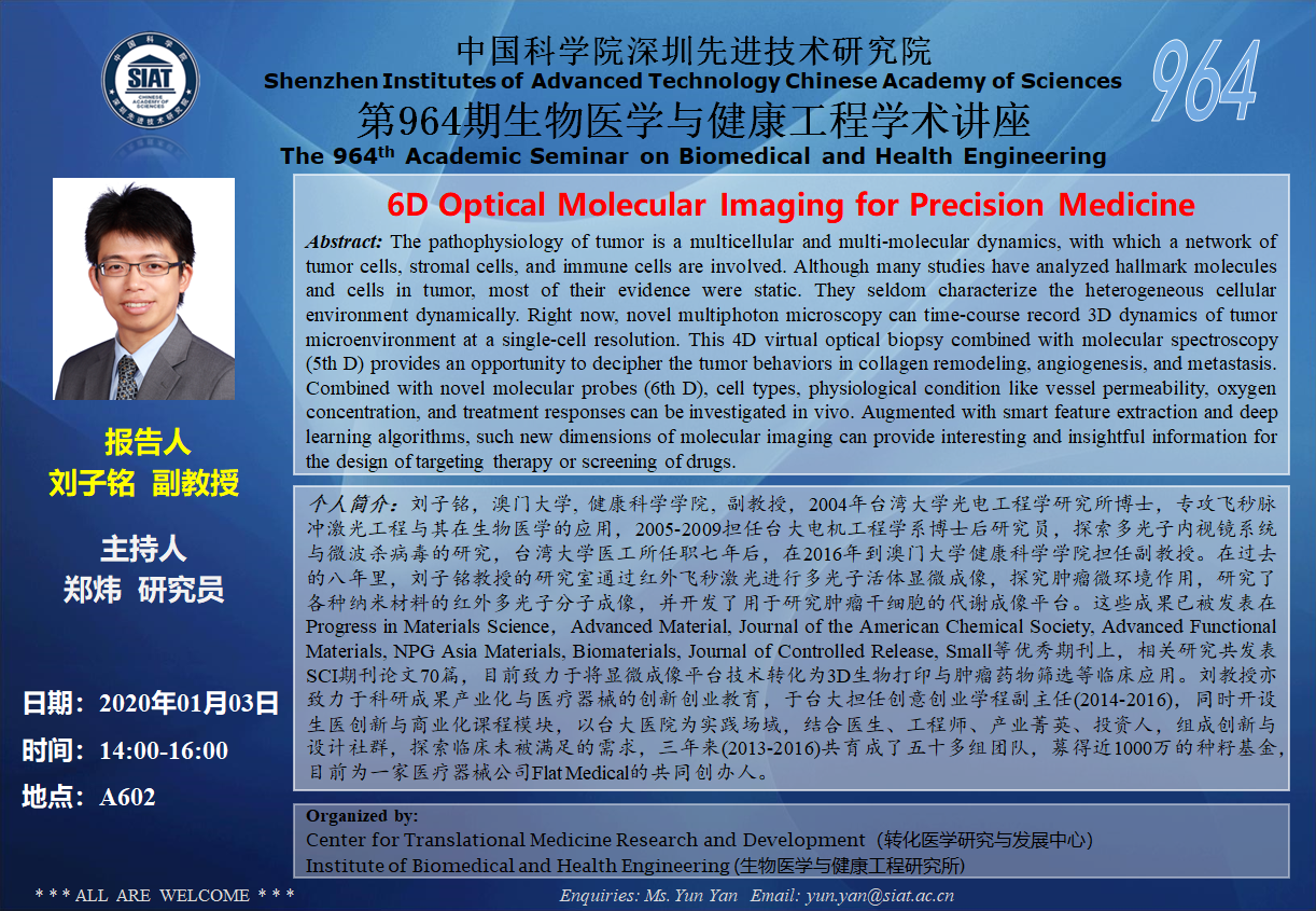 大家好!医工所将于2020年1月3日(周五)下午14:00-16:00,在 A602会议室 举办第964期生物医学与健康工程学术讲座,特邀 澳门大学 刘子铭副教授 作题为“6D Optical Molecular Imaging for Precision Medicine”的学术报告。诚挚邀请大家参加学习和交流!