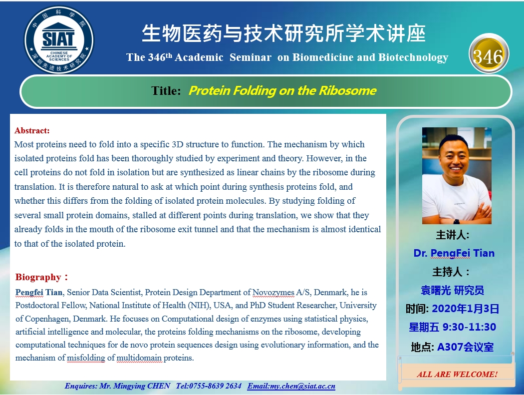 医药所第346期学术讲座将于2020年1月3日星期五9:30-11:30在先进院A307会议室举行。本次讲座邀请了来自丹麦鲍斯韦的生物技术公司Dr. PengFei Tian带来“ Protein Folding on the Ribosome ”的报告。届时,袁曙光 研究员将主持讲座。