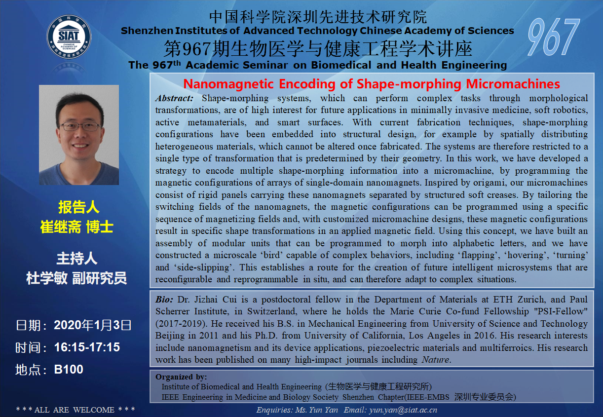 大家好!医工所将于2020年1月3日(周五)下午16:15-17:15,在 B100会议室 举办第967期生物医学与健康工程学术讲座,特邀 苏黎世理工学院 崔继斋博士 作题为“Nanomagnetic Encoding of Shape-morphing Micromachines”的学术报告。诚挚邀请大家参加学习和交流!