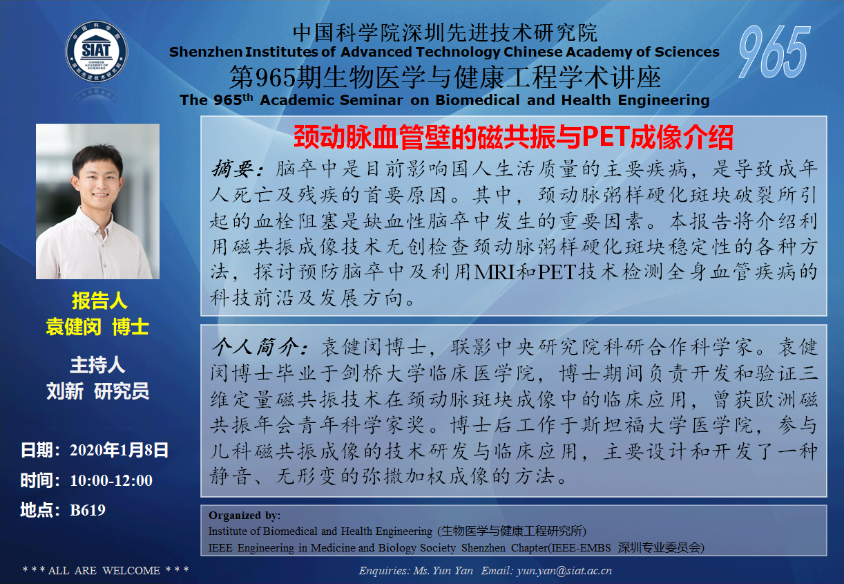 大家好!医工所将于2020年1月8日(周三)上午10:00-12:00,在 B619会议室 举办第965期生物医学与健康工程学术讲座,特邀 联影中央研究院 袁健闵博士 作题为“颈动脉血管壁的磁共振与PET成像介绍”的学术报告。诚挚邀请大家参加学习和交流!