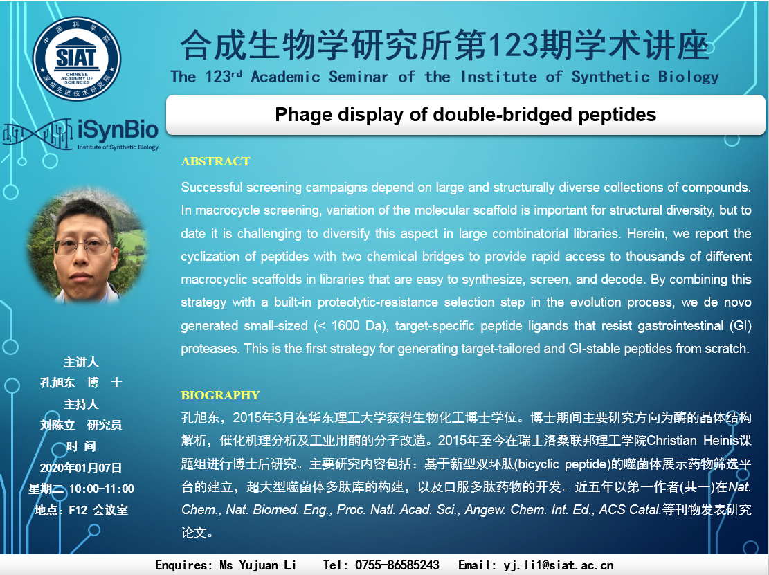 本次讲座邀请了 瑞士洛桑联邦理工学院 孔旭东 博士 带来“Phage display of double-bridged peptides”的报告。