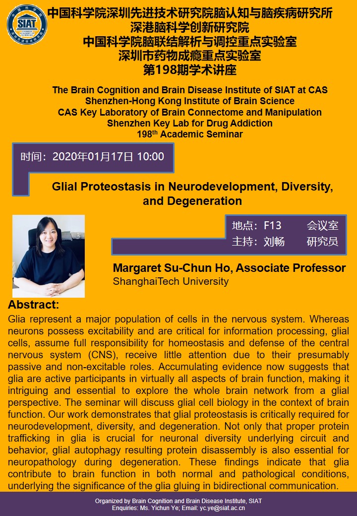 大家好!脑认知与脑疾病研究所将于2020年01月17日10:00,在A504会议室举办第一百九十八期学术讲座,本次讲座由上海科技大学的Margaret Su-Chun Ho副教授做题为“Glial Proteostasis in Neurodevelopment, Diversity, and Degeneration”的专题报告。