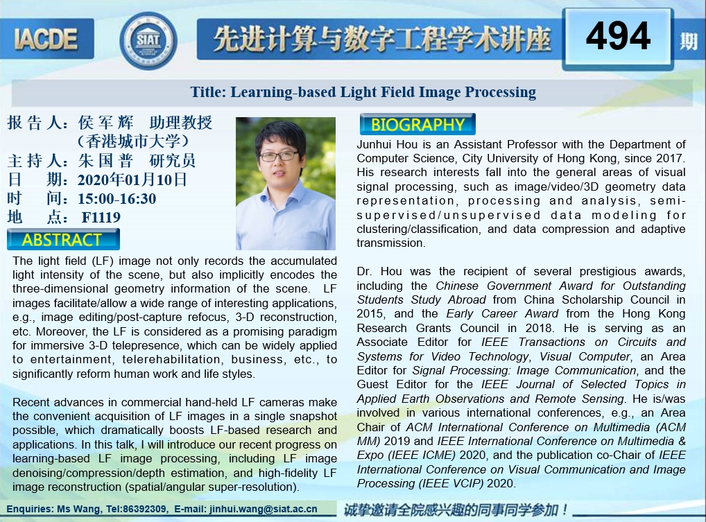 大家好!先进计算与数字工程学术讲座第494期将于1月10日 15:00-16:30在F栋1119会议室举行,本次讲座将邀请香港城市大学 侯军辉 助理教授作题为“Learning-based Light Field Image Processing ”的报告。本次报告将由数字所朱国普 研究员主持,诚挚邀请大家参加、学习和交流!