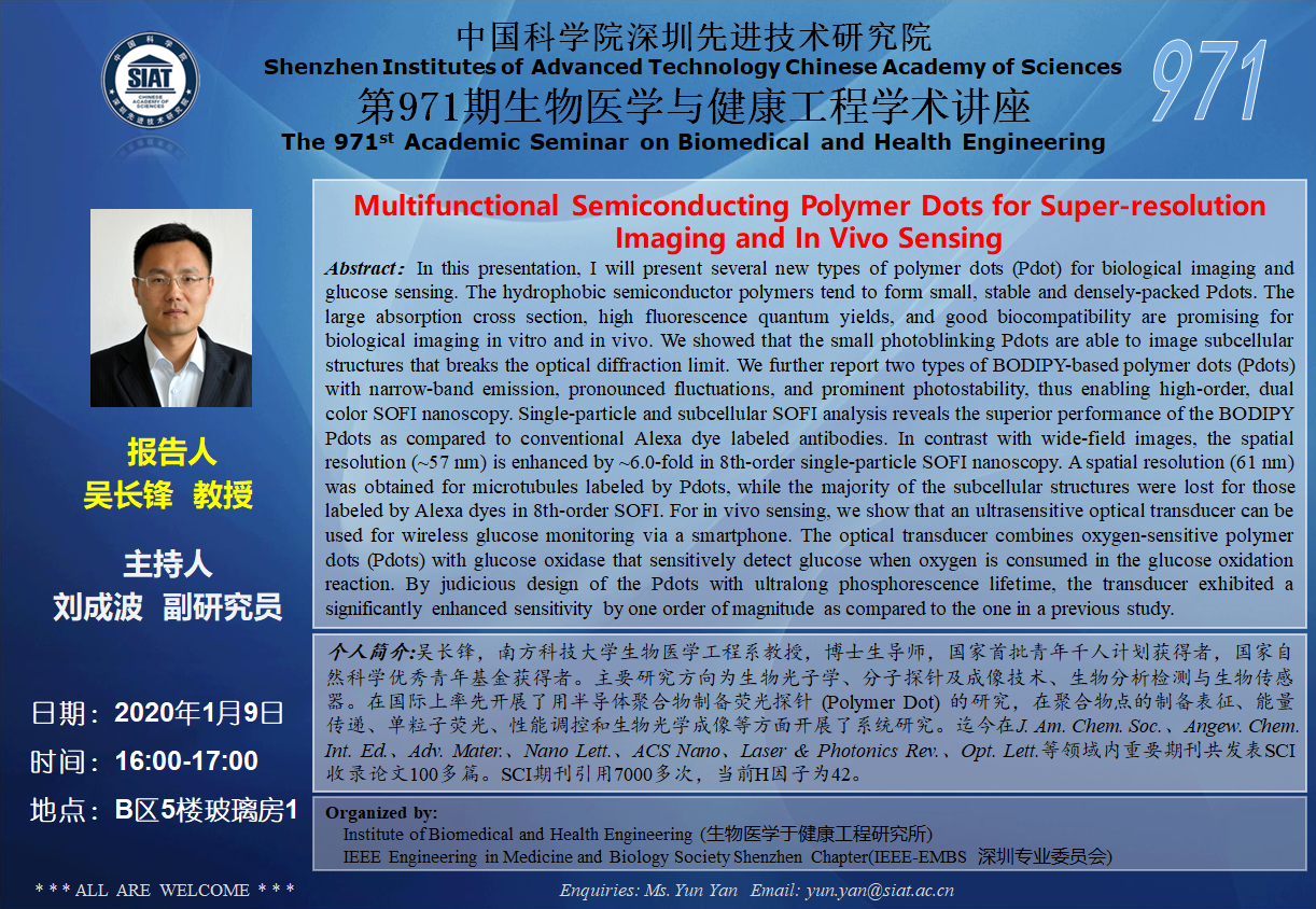 大家好!医工所将于2020年1月9日(周四)下午16:00-17:00,在 B区5楼玻璃房1 举办第971期生物医学与健康工程学术讲座,特邀 南方科技大学 吴长锋教授 作题为“Multifunctional Semiconducting Polymer Dots for Super-resolution Imaging and In Vivo Sensing”的学术报告。诚挚邀请大家参加学习和交流!