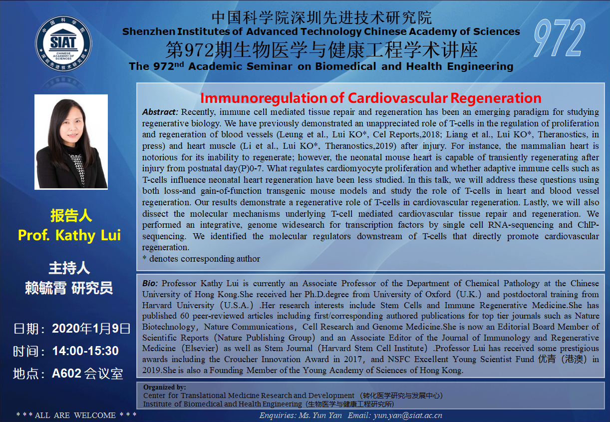 大家好!医工所将于2020年1月9日(周四)下午13:30-15:00,在 A602会议室 举办第972期生物医学与健康工程学术讲座,特邀 香港中文大学威尔士亲王医院 Kathy Lui教授 作题为“Immunoregulation of Cardiovascular Regeneration”的学术报告。诚挚邀请大家参加学习和交流!