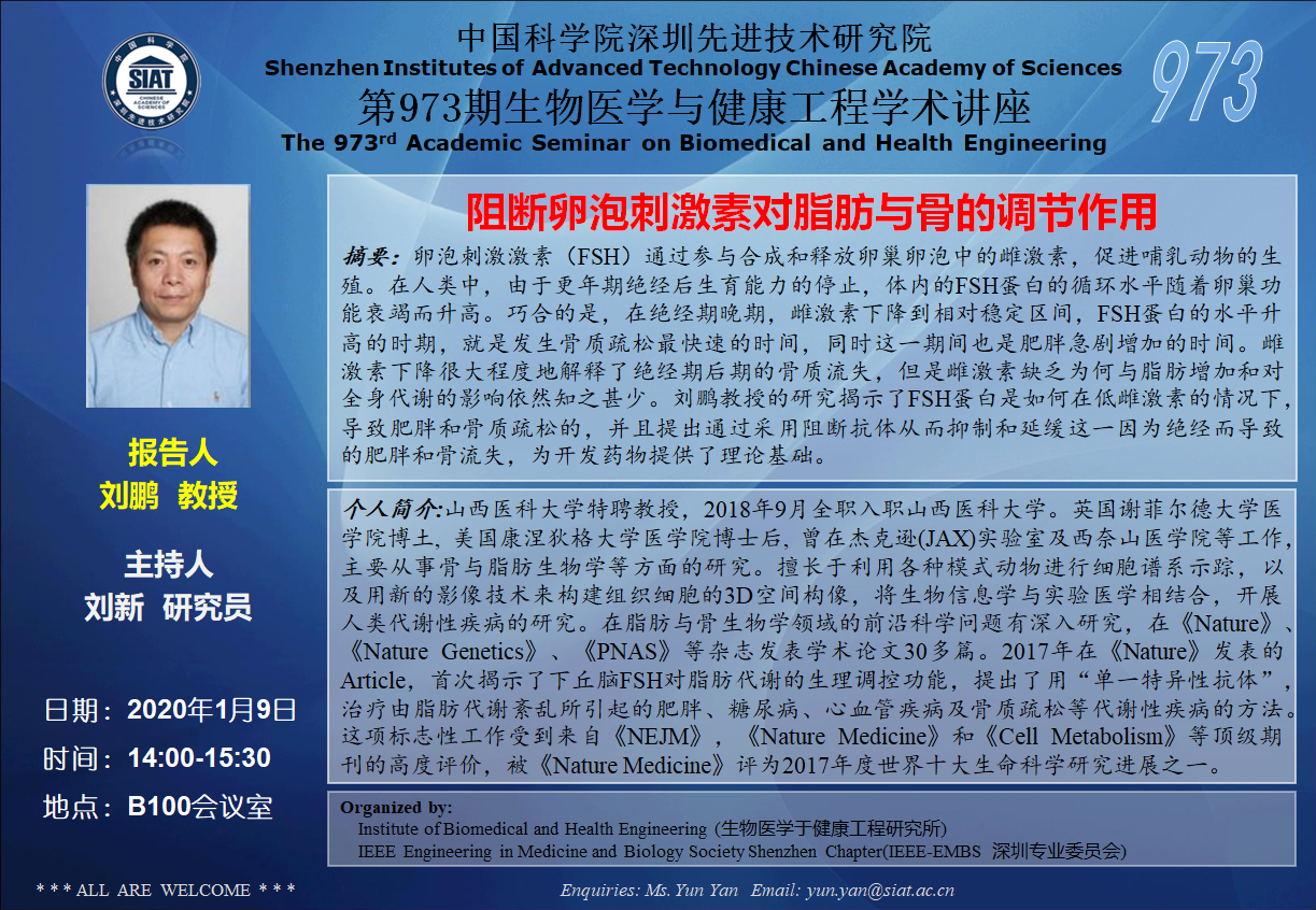 大家好!医工所将于2020年1月9日(周四)下午14:00-15:30,在 B100会议室 举办第973期生物医学与健康工程学术讲座,特邀 山西医科大学 刘鹏教授 作题为“阻断卵泡刺激素对脂肪与骨的调节作用”的学术报告。诚挚邀请大家参加学习和交流!
