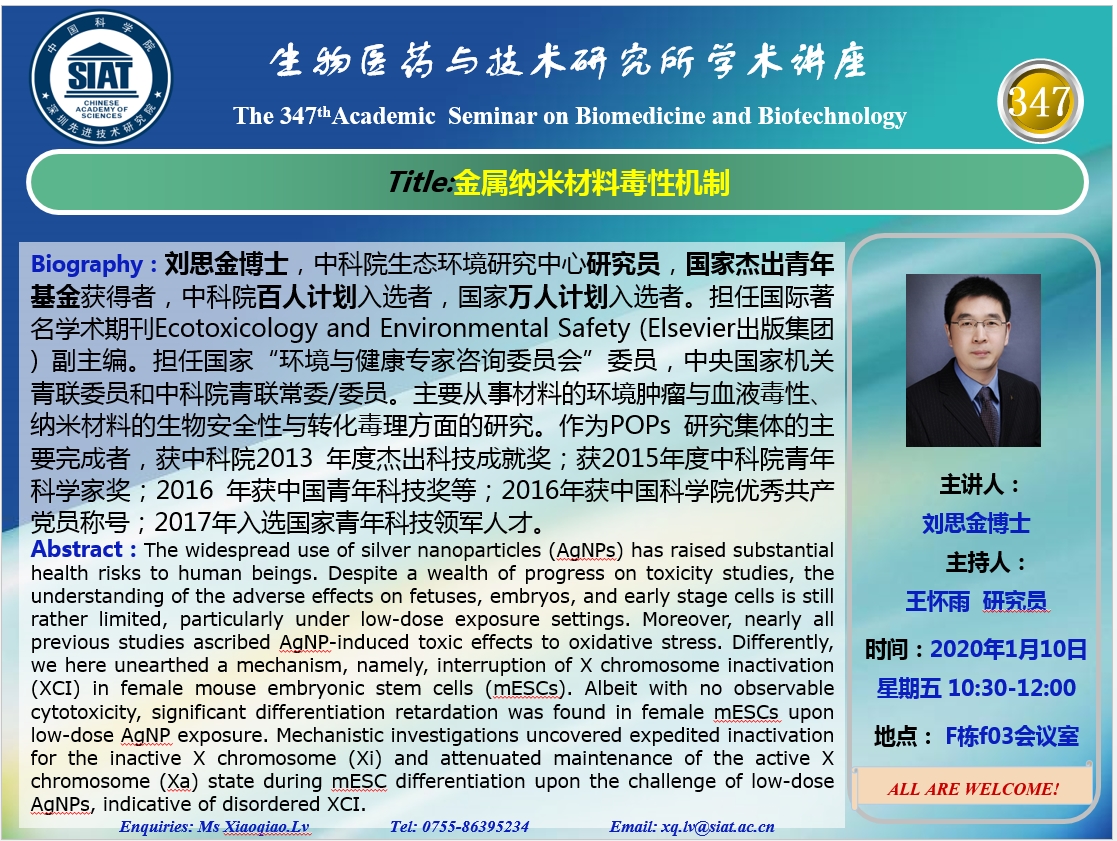 医药所第347期学术讲座将于2020年1月10日星期五10:30-12:00在先进院F栋f03会议室举行。本次讲座邀请了来自中科院生态环境研究中心 刘思金 研究员 带来“ 金属纳米材料毒性机制 ”的报告。届时,王怀雨 研究员将主持讲座。