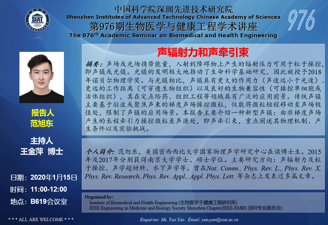 大家好!医工所将于2020年1月15日(周三)上午11:00-12:00,在 B619会议室 举办第976期生物医学与健康工程学术讲座,特邀 美国密西西比大学国家物理声学研究中心 范旭东 作题为“声辐射力和声牵引束”的学术报告。诚挚邀请大家参加学习和交流!