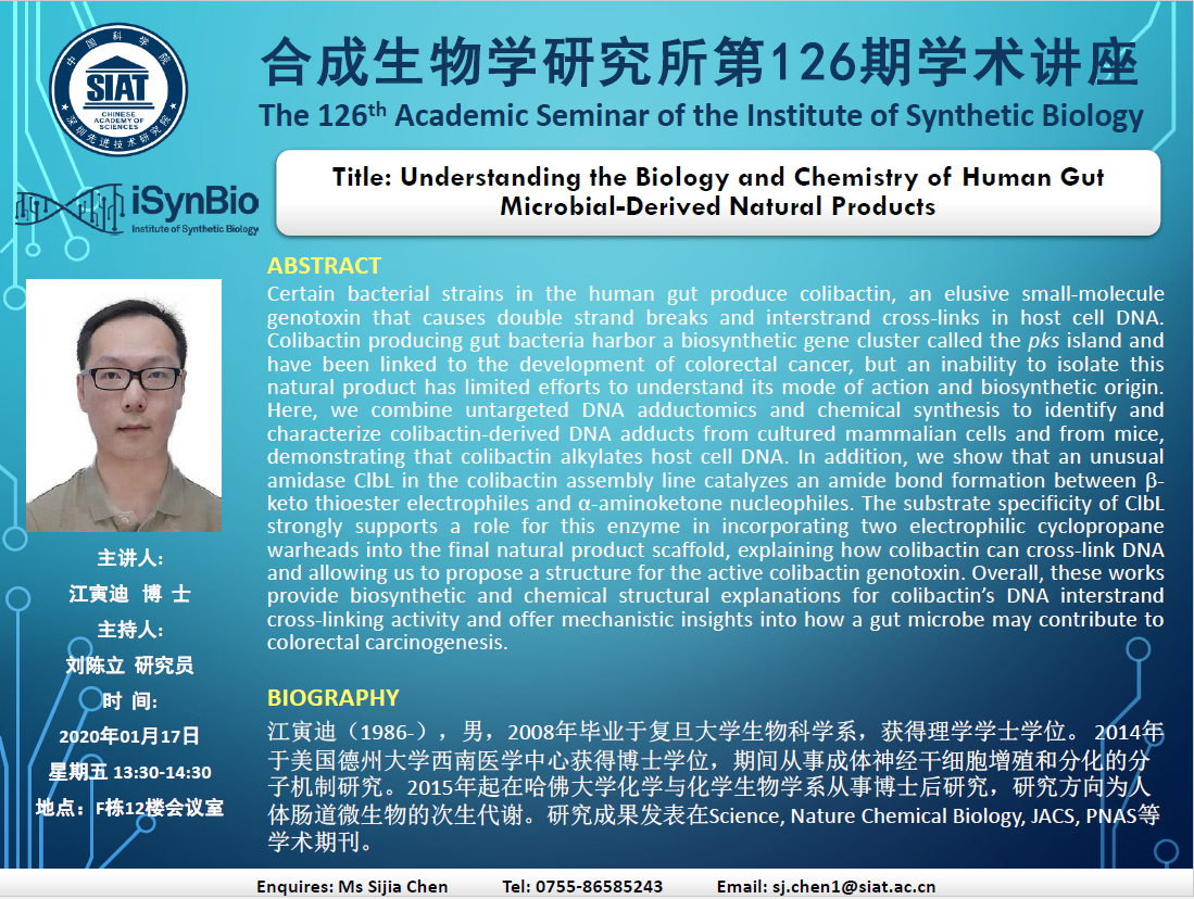 本次讲座邀请了 哈佛大学 江寅迪 博士 带来“Understanding the Biology and Chemistry of Human Gut Microbial-Derived Natural Products”的报告。
