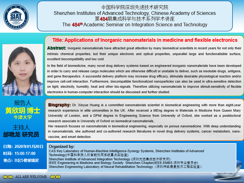 集成所第484期集成科学与技术系列学术讲座将于1月20日下午15:00~17:00在B区5楼玻璃房会议室召开。本次讲座特邀牛津大学的黄欣玥博士作题为《Applications of Inorganic nanomaterials in medicine and flexible electronics》的学术报告。