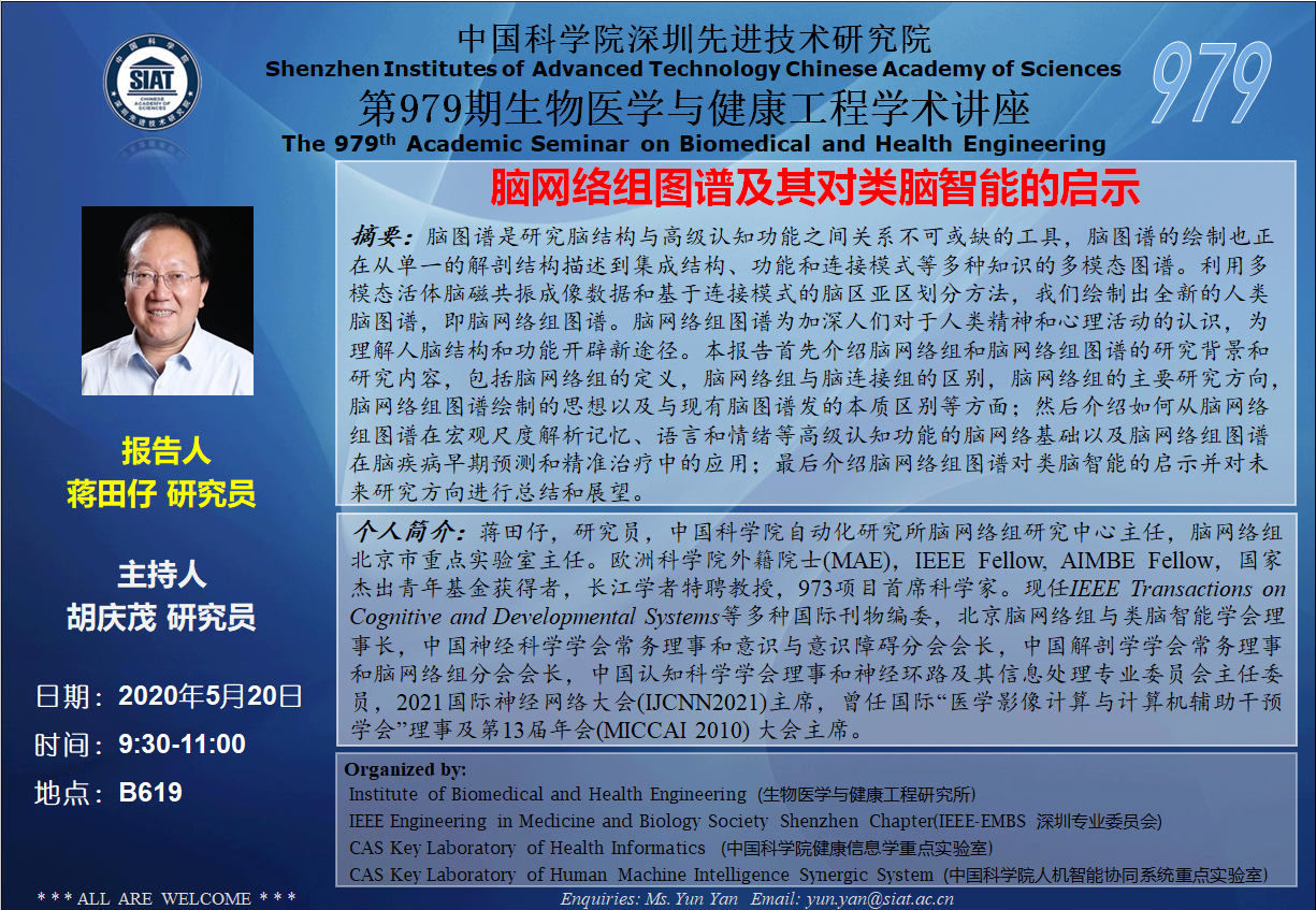 大家好!医工所将于2020年5月20日(周三)上午09:30-11:00,在B619会议室举办第979期生物医学与健康工程学术讲座,特邀 中国科学院自动化研究所 蒋田仔研究员 作题为“脑网络组图谱及其对类脑智能的启示”的学术报告。诚挚邀请大家参加学习和交流!