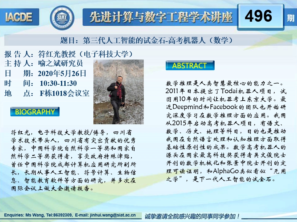 大家好!先进计算与数字工程学术讲座第496期将于5月26日 10:30-11:30在F栋1018会议室举行,本次讲座将邀请电子科技大学 符红光教授作题为“第三代人工智能的试金石-高考机器人(数学)”的报告。本次报告将由数字所喻之斌 研究员主持,诚挚邀请大家参加、学习和交流!