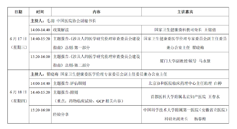 大家好!人体实验伦理在线培训通知:由国家卫生健康医学伦理专家委员办公室和中国医院协会主办的《涉及人的临床研究伦理审查委员会建设指南》宣贯在线培训班,于本周三、四(18日14:00-16:00)线上召开,周四的主题为伦理评估细则、药物临床试验、GCP等内容。