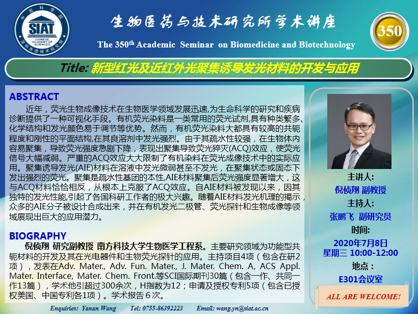 医药所第350期学术讲座将于2020年7月8日 星期三 10:00-12:00在先进院E301会议室举行。本次讲座邀请了来自南方科技大学生物医学工程系 倪侦翔 研究副教授带来“ 新型红光及近红外光聚集诱导发光材料的开发与应用”的报告。届时,张鹏飞 副研究员将主持讲座。