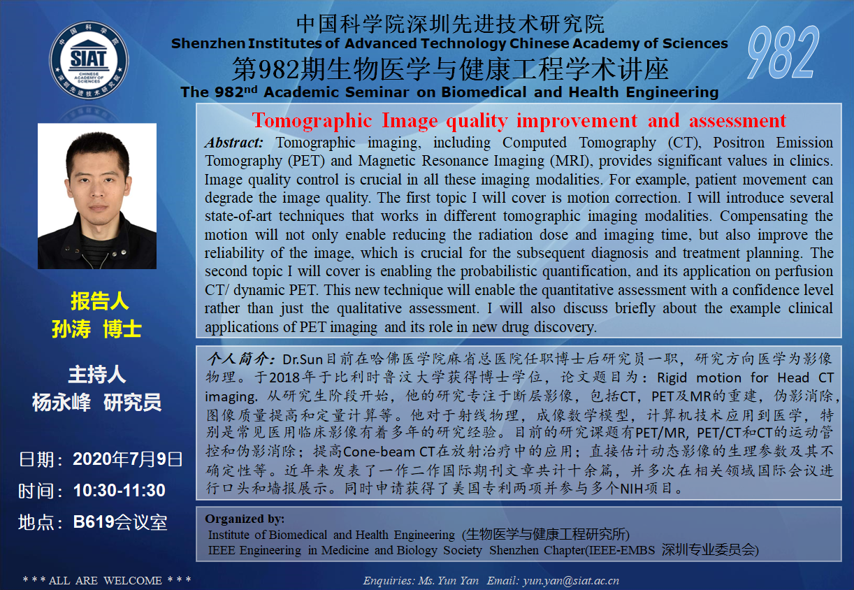 大家好!医工所将于2020年7月9日(周四)上午10:30-11:30,在B619会议室举办第982期生物医学与健康工程学术讲座,特邀 哈佛医学院麻省总医院 孙涛博士 作题为“Tomographic Image quality improvement and assessment”的学术报告。诚挚邀请大家参加学习和交流!