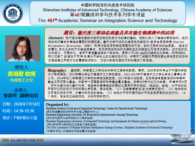 集成所第487期集成科学与技术系列学术讲座将于7月14日(周二)下午14:30~15:30在F栋6楼会议室召开。本次讲座特邀华南理工大学的龚湘君教授作题为《微尺度三维动态成像及其在微生物观测中的应用》的学术报告。