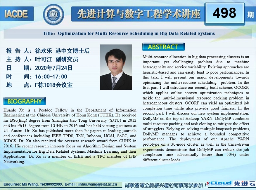 数字所第498期学术讲座《Optimization for Multi-Resource Scheduling in Big Data Related Systems》(香港中文大学 徐欢乐 博士,7月24日 16:00-17:00,F1018)