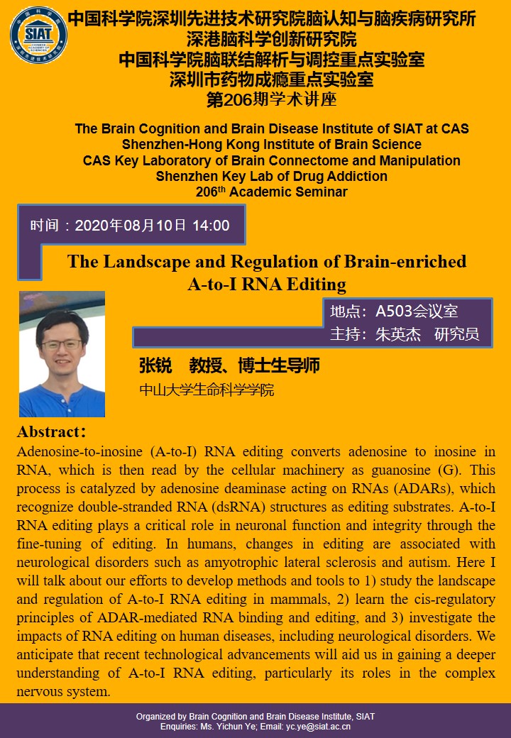 脑认知与脑疾病研究所第二百零六期学术讲座《The Landscape and Regulation of Brain-enriched A-to-I RNA Editing》(中山大学生命科学学院,张锐教授,2020年8月10日14:00,A503会议室)