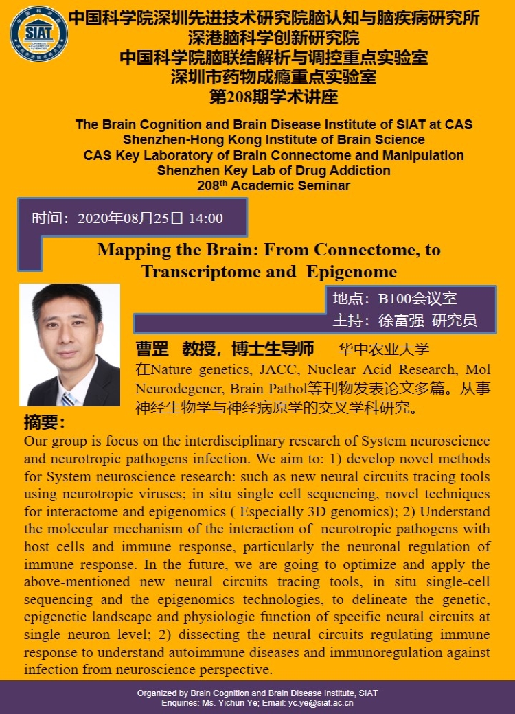大家好!脑认知与脑疾病研究所将于2020年8月25日14:00,在B100会议室举办第二百零八期学术讲座,本次讲座由华中农业大学,曹罡教授做题为“Mapping the Brain: From Connectome, to Transcriptome and Epigenome”的专题报告。