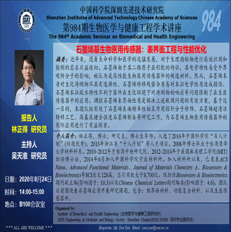 大家好!医工所将于2020年8月24日(周一)下午14:00-15:00,在B100会议室举办第984期生物医学与健康工程学术讲座,特邀 中国科学院宁波材料所 林正得研究员 作题为“石墨烯基生物医用传感器:表界面工程与性能优化”的学术报告。诚挚邀请大家参加学习和交流!