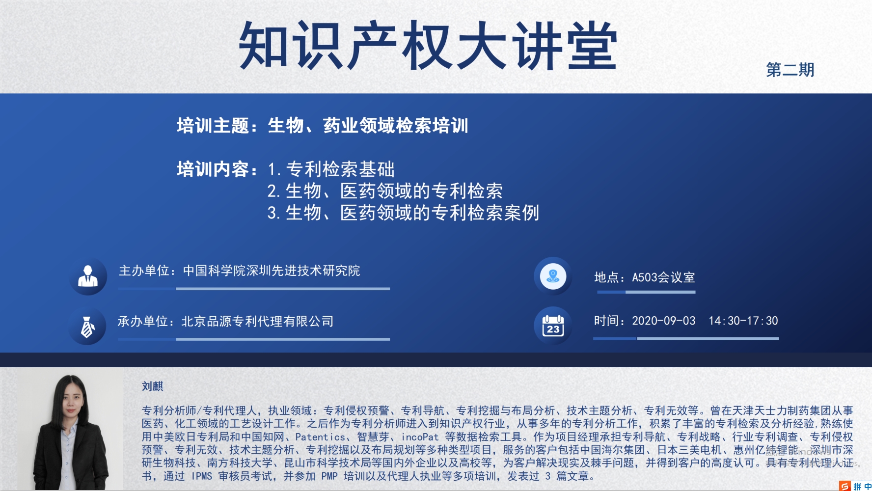 第2期SIAT知识产权大讲堂(专利分析师/代理师 刘麒 ,9月3日周四14:30-17:30)