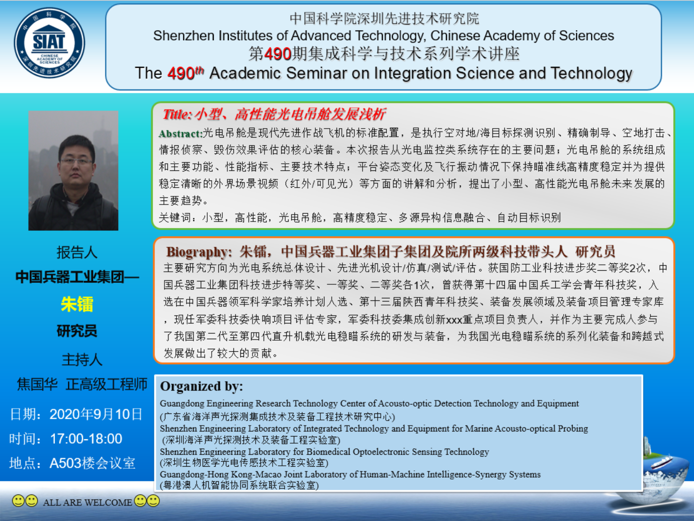 集成所第490期集成科学与技术系列学术讲座将于9月10日下午17:00~18:00在A601会议室召开。本次讲座特邀中国兵器工业集团的朱镭研究员作题为《小型、高性能光电吊舱发展浅析》的学术报告。