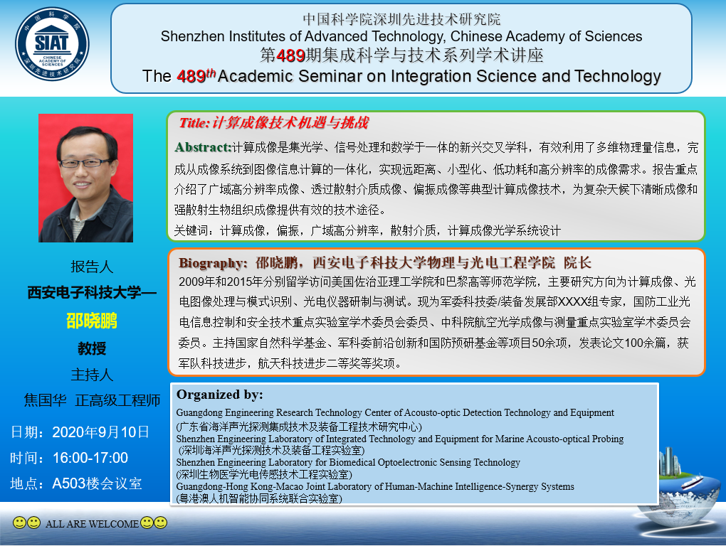 集成所第489期集成科学与技术系列学术讲座将于9月10日下午16:00~17:00在A601会议室召开。本次讲座特邀西安电子科技大学的邵晓鹏教授作题为《计算成像技术机遇与挑战》的学术报告。