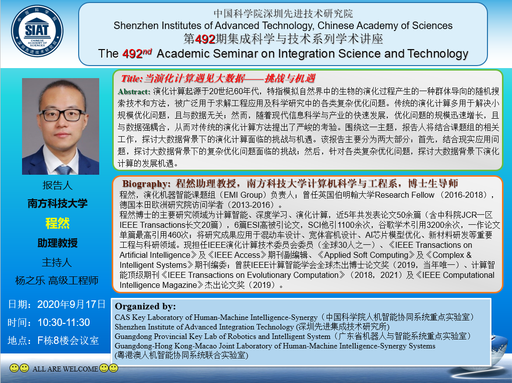 集成所第492期集成科学与技术系列学术讲座将于9月17日上午10:30~11:30在F栋8楼会议室召开。本次讲座特邀南方科技大学的程然助理教授作题为《当演化计算遇见大数据——挑战与机遇》的学术报告。